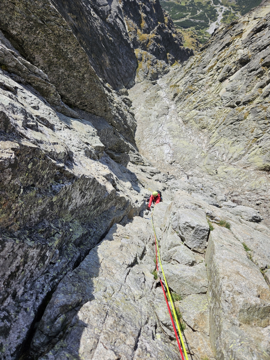 Druhý den jsme dost použití, rozhodnuto je lehké kratší lezení pod Terynkou na Žltou vežu. Korosadowiče (lezli jsme před pár lety, pamatuji si samozřejmě prd jen že to bylo v cajku) začíná tahat Dája, je spokojen akorát asi únava z předchozího dne v kombinaci se špatným stravováním si vybírá daň – je mu šoufl. Dále tedy tahá Sham, Dája se uprostřed na štandu vyblije, ale i tak mu není do skoku. Dolézáme jinak celkem bez problémů, cesta je to pohodová, dojištěná vrtanými štandy + občas i mezijištěními. Pro urychlení sestupu při objevení fajn slanovacího chumlu smyc volím slanění z hřebene směr jih místo obcházení přes Terynku. Slanění na 2x 60m taktak vydá pod skály do sutě (s lehkým doskakováním \ traverzováním mechů) a i lano se podaří stáhnout, úspěch. Tekutá suť je humus a poslední hřebík do rakve.